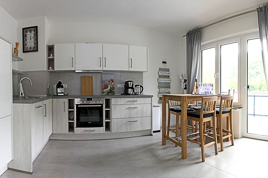 • Komplett eingerichtete Küche mit Geschirrspülmaschine, Ceranfeld und Mikrowelle